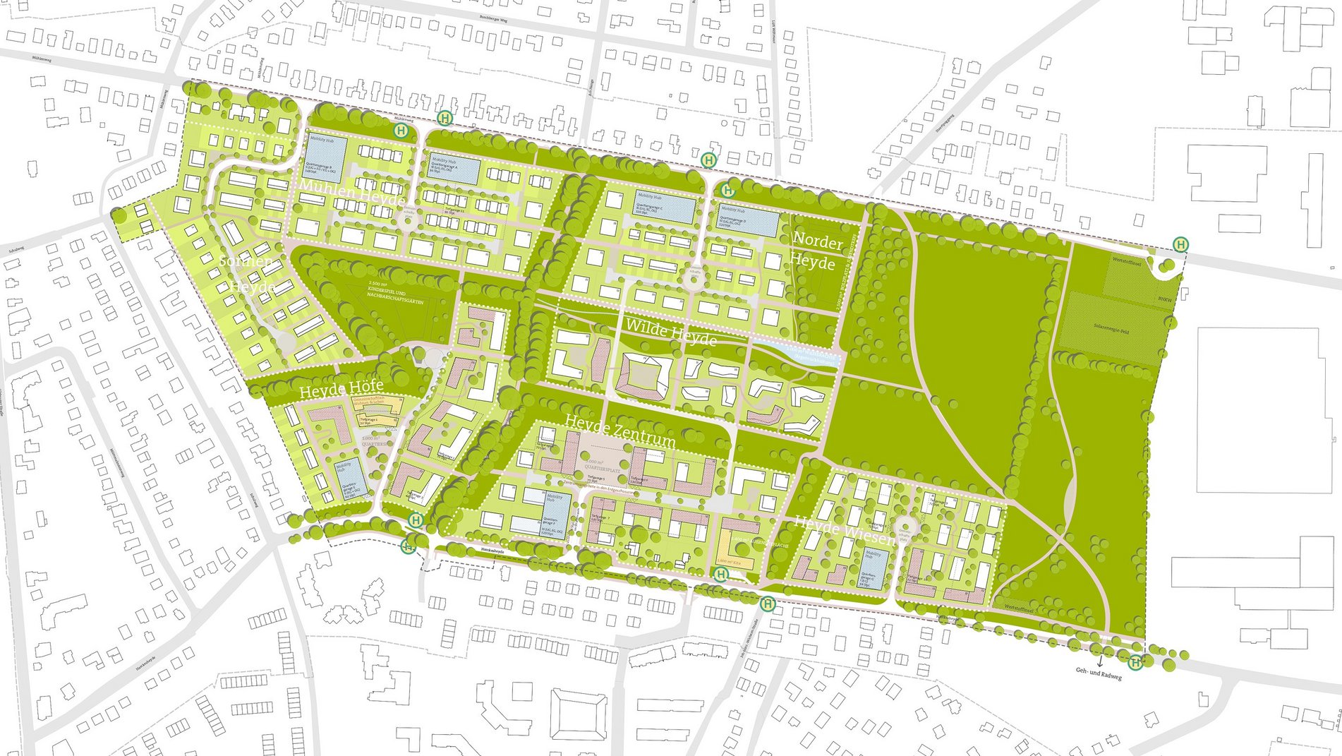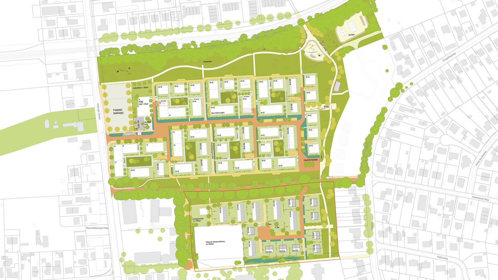 Wohnviertel mit experimentellen Bauweisen und innovativen Wohnideen. 15 ha für etwa 600 Wohneinheiten, Kita, Schulerweiterung und Parkanlagen.